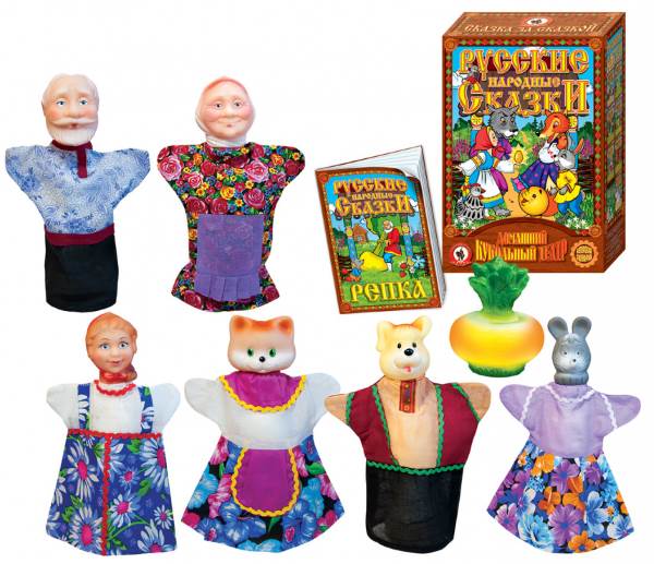 Состав кукол-перчаток в наборе: Дед, Внучка, Кошка, Бабка, Жучка, Мышка, Репка