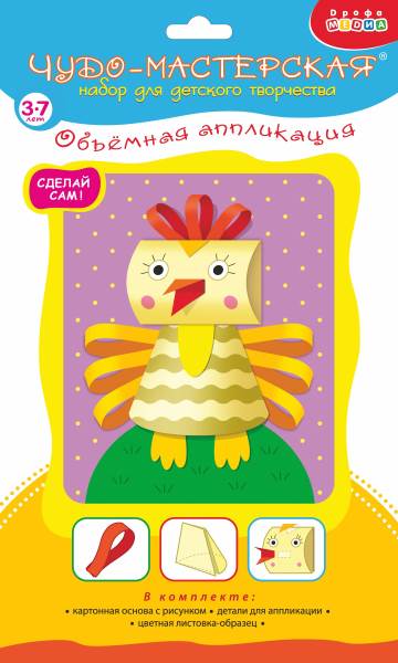 Бумагу, как известно, изобрели в Китае, а вот искусство аппликации появилось значительно раньше — на заре человеческой эпохи как способ украшения одежды и обуви. В настоящее время аппликация стала одним из первых видов искусства, который осваивают наши дети. С помощью набора для творчества «Объёмная аппликация» юный творец создаст красочную картинку с объёмными элементами. Поделка проста в исполнении — возьмите уже вырубленные детали картинки, с помощью инструкции сделайте некоторые из них выпуклыми или «плиссированными» и наклейте на картинку-основу. Готовую аппликацию можно не только повесить на стенку в качестве украшения, но и использовать во время игры.