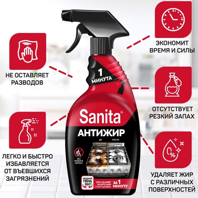 Чистящее средство антижир "1 минута", спрей, курок, "Sanita"