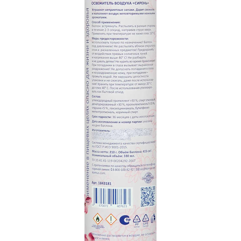 Способ применения: баллон встряхнуть. Распылять в разные стороны в течение 2–3 секунд, направив струю вверх. Применять при температуре не ниже плюс 10 °C.Состав: углеводородный пропеллент >30%, спирт этиловый денатурированный >30%, пропиленгликоль 5–15%, отдушка <5%, гексилциннамаль, бутилфенил метилпропиональ, коричный спирт.
