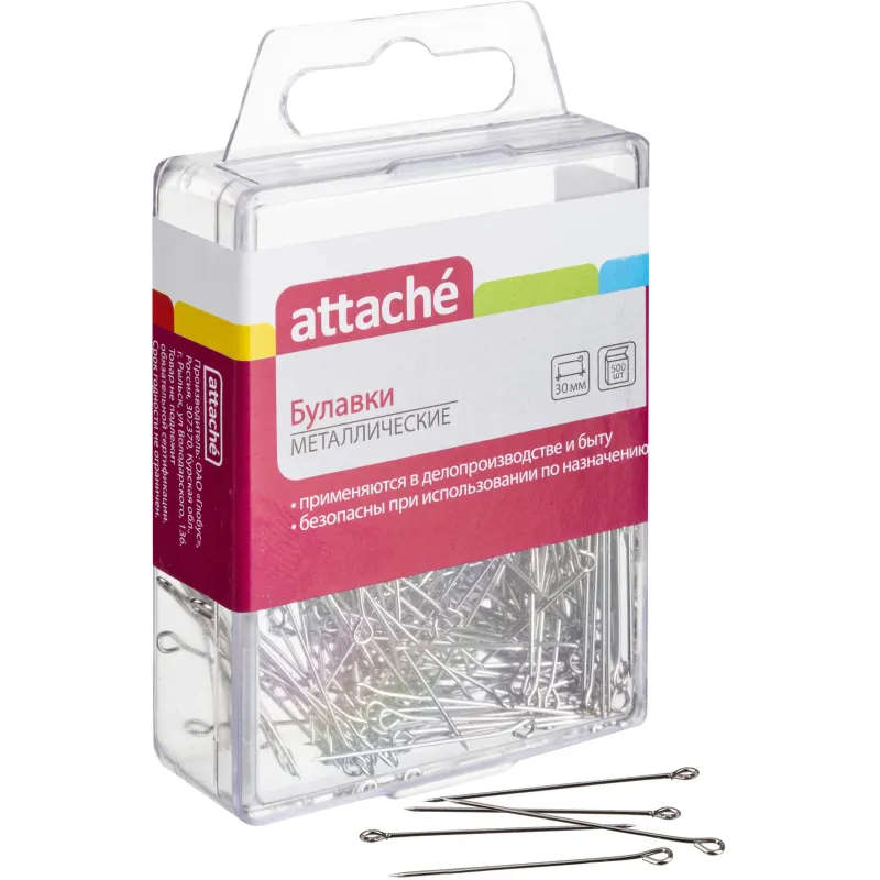 Булавки металлические, ушко, игла 30 мм, уп. 500 шт, пластиковый бокс, "Attache"