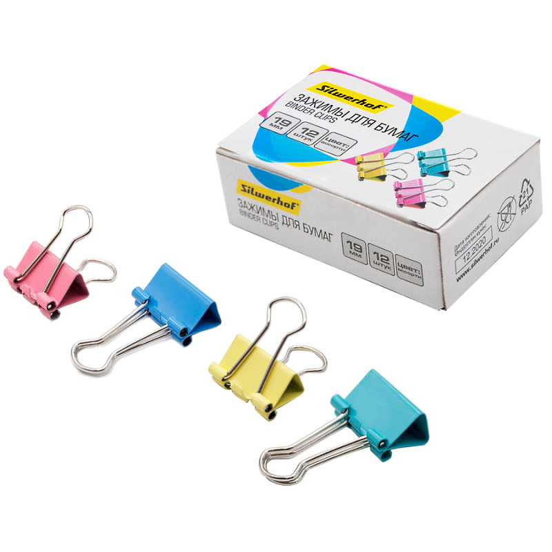 Цветные зажимы металлические 19 мм, до 80 л, 12 шт, картонная упак, "Silwerhof"
