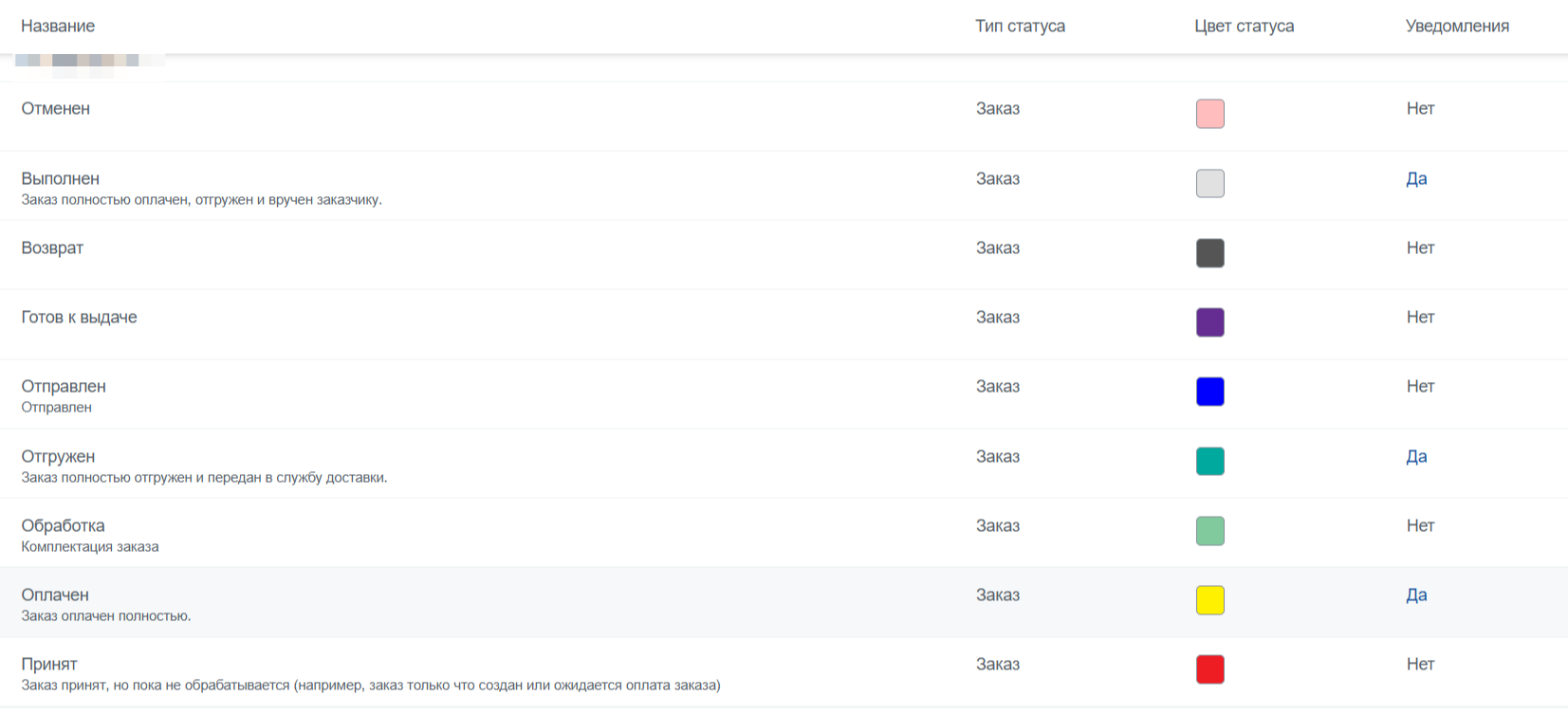 Типы статусов заказов:
